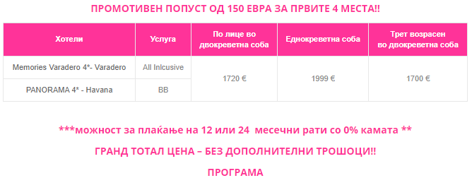 Состанок на групата и средба со водичот во 18:55 часот на Меѓународниот аеродром Скопје. Полетуваме од Скопје кон Истанбул во 20:55 часот. Слетуваме во Истанбул во 23:30 часот, а летот кон Хавана е во 01:45 часот.