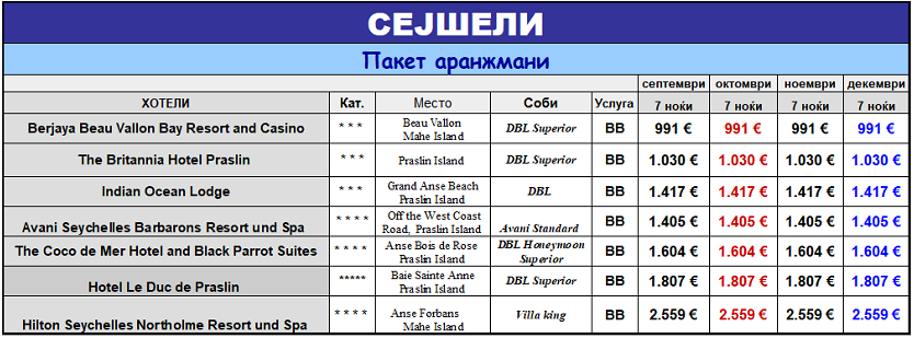 Полетување од Доха во 2:00 часот пристигнување во Сејшели во 08:35 часот.