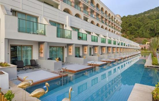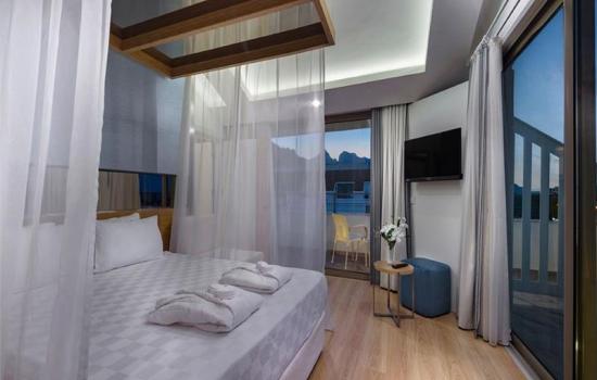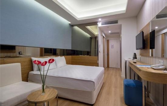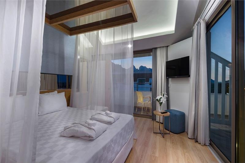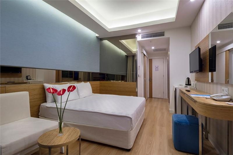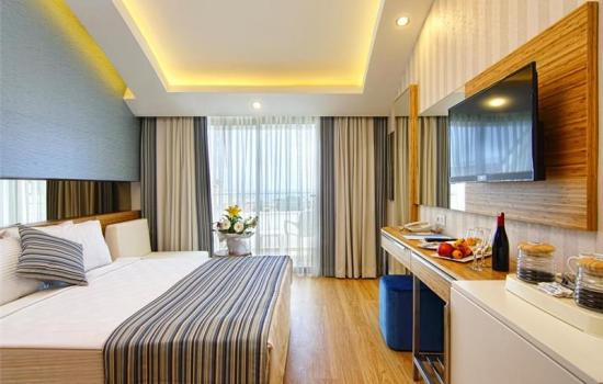 Вкупен број на соби 440 во два блока. Стандардни соби (22m²; една спална соба со француски кревет + софа , една бања, макс.2 + 1лице), Стандардни соби со кревети на спрат (26м², една спална соба со француски кревет + кревет на спрат за деца, една бања, макс.2 + 2лица), Фамилијарни соби со кревети на спрат (32м ; две спални соби со врата помеѓу, во една спална соба е француски кревет во друга соба кревет на спрат + дополнителен кревет, една бања, макс.3 + 2лица), Swim up соби(26м², една спална соба , една бања, терасата е директно поврзана со базенот, макс.2 + 1лице), Garden Block стандардните соби се исти како стандардни соби во главниот блок, сместени во Б блок и само поглед на копно), Love suit (22м², Една спална соба со француски кревет, една бања, голема тераса со џакузи, директен поглед кон море и базен, макс.2лице). Сите соби се со сопствено купатило со туш кабина, фен, клима уред , телефон, мини бар (вода, минерална вода, безалкохолни пијалоци се дополнуваат при пристигнување), електричен бокал, чај и кафе, сеф, кутија, бањарка, WI- FI Интернет (мала брзина), сателитски ТВ и музички канали, балкон.